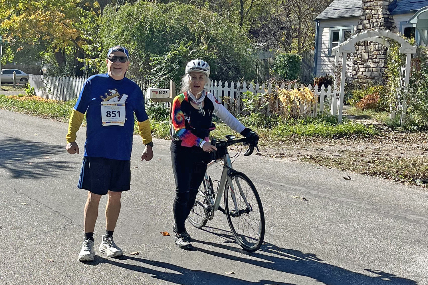 We have some amazing people who help with the runs in Lawrence. Around mile marker 9 of yesterday's Kansas Half Marathon, Ken Fangohr noticed volunteer bicycle pacer Elim Myers walking her bicycle along with a runner who was walking. Brent Barnett was injured but was only able to walk slowly. This was four hours after the event had started and Brent was by himself. Elim stayed with him all the way to the finish line. A great job for someone who truly cares!